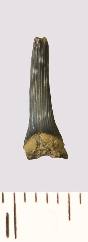 Зуб (фрагмент). Акула. Scapanorhynchus rhaphiodon Agassiz, 1843. Классификация: Хордовые Chordata, Позвоночные Vertebrata, Хрящевые рыбы Chondrichthyes, Пластиножаберные Elasmobranchii
