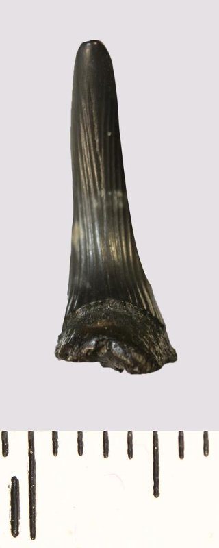 Зуб (фрагмент). Акула. Scapanorhynchus rhaphiodon Agassiz, 1843. Классификация: Хордовые Chordata, Позвоночные Vertebrata, Хрящевые рыбы Chondrichthyes, Пластиножаберные Elasmobranchii