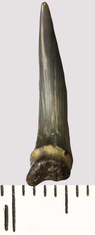 Зуб (фрагмент). Акула. Scapanorhynchus rhaphiodon Agassiz, 1843. Классификация: Хордовые Chordata, Позвоночные Vertebrata, Хрящевые рыбы Chondrichthyes, Пластиножаберные Elasmobranchii
