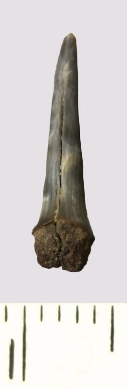 Зуб (фрагмент). Акула. Scapanorhynchus rhaphiodon Agassiz, 1843. Классификация: Хордовые Chordata, Позвоночные Vertebrata, Хрящевые рыбы Chondrichthyes, Пластиножаберные Elasmobranchii