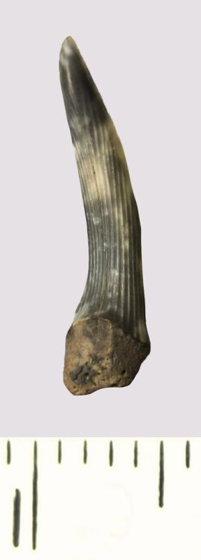 Зуб (фрагмент). Акула. Scapanorhynchus rhaphiodon Agassiz, 1843. Классификация: Хордовые Chordata, Позвоночные Vertebrata, Хрящевые рыбы Chondrichthyes, Пластиножаберные Elasmobranchii