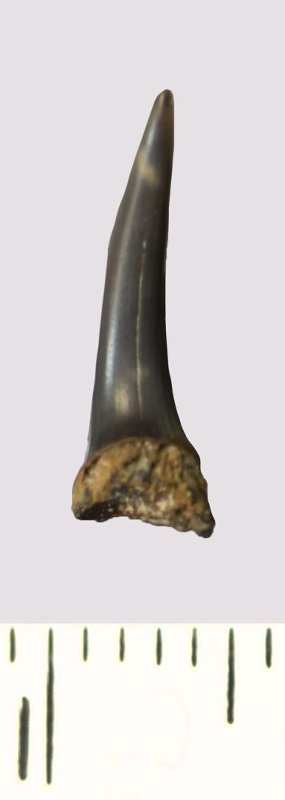 Зуб (фрагмент). Акула. Scapanorhynchus rhaphiodon Agassiz, 1843. Классификация: Хордовые Chordata, Позвоночные Vertebrata, Хрящевые рыбы Chondrichthyes, Пластиножаберные Elasmobranchii