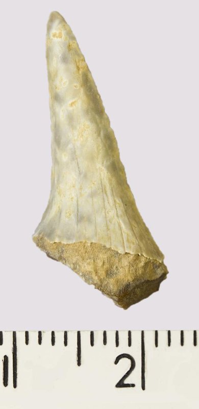 Зуб (фрагмент). Акула. Scapanorhynchus gigas Woodward, 1889. Классификация: Хордовые Chordata, Позвоночные Vertebrata, Хрящевые рыбы Chondrichthyes, Пластиножаберные Elasmobranchii