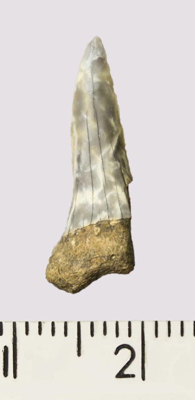 Зуб. Акула. Scapanorhynchus gigas Woodward, 1889. Классификация: Хордовые Chordata, Позвоночные Vertebrata, Хрящевые рыбы Chondrichthyes, Пластиножаберные Elasmobranchii