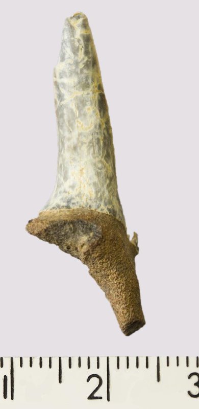 Зуб. Акула. Scapanorhynchus gigas Woodward, 1889. Классификация: Хордовые Chordata, Позвоночные Vertebrata, Хрящевые рыбы Chondrichthyes, Пластиножаберные Elasmobranchii