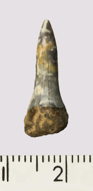 Зуб. Акула. Scapanorhynchus gigas Woodward, 1889. Классификация: Хордовые Chordata, Позвоночные Vertebrata, Хрящевые рыбы Chondrichthyes, Пластиножаберные Elasmobranchii
