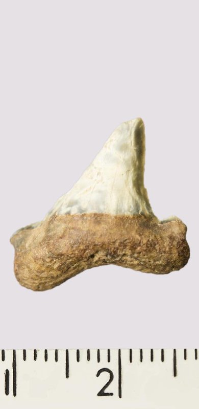 Зуб. Акула. Scapanorhynchus gigas Woodward, 1889. Классификация: Хордовые Chordata, Позвоночные Vertebrata, Хрящевые рыбы Chondrichthyes, Пластиножаберные Elasmobranchii