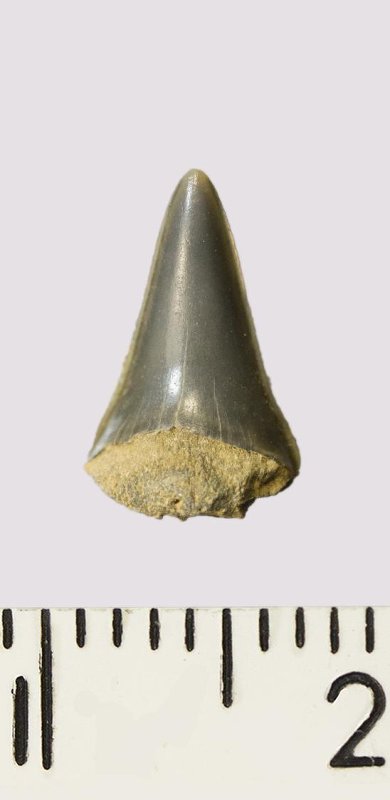 Зуб (фрагмент). Акула. Odontaspis macrorhiza (Cope) Leriche, 1902. Классификация: Хордовые Chordata, Позвоночные Vertebrata, Хрящевые рыбы Chondrichthyes, Пластиножаберные Elasmobranchii