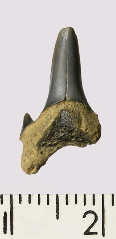 Зуб. Акула. Odontaspis macrorhiza (Cope) Leriche, 1902. Классификация: Хордовые Chordata, Позвоночные Vertebrata, Хрящевые рыбы Chondrichthyes, Пластиножаберные Elasmobranchii