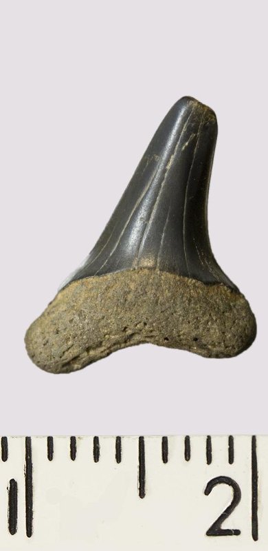 Зуб. Акула. Odontaspis macrorhiza (Cope) Leriche, 1902. Классификация: Хордовые Chordata, Позвоночные Vertebrata, Хрящевые рыбы Chondrichthyes, Пластиножаберные Elasmobranchii