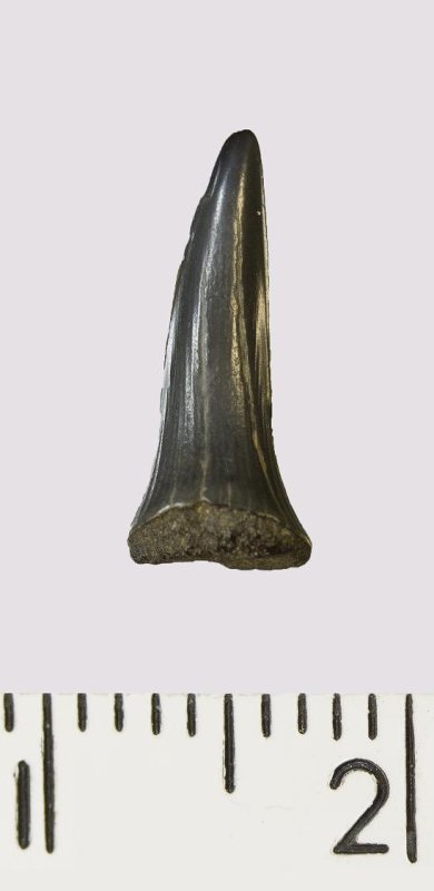 Зуб (фрагмент). Акула. Scapanorhynchus rhaphiodon Agassiz, 1843. Классификация: Хордовые Chordata, Позвоночные Vertebrata, Хрящевые рыбы Chondrichthyes, Пластиножаберные Elasmobranchii