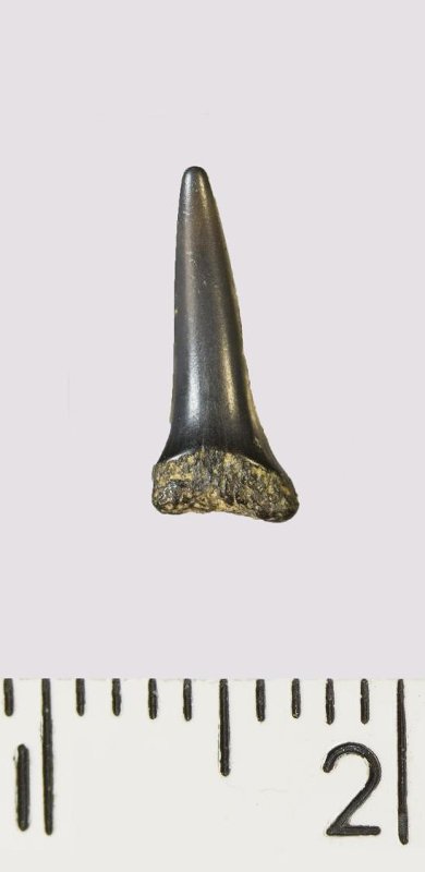 Зуб (фрагмент). Акула. Scapanorhynchus rhaphiodon Agassiz, 1843. Классификация: Хордовые Chordata, Позвоночные Vertebrata, Хрящевые рыбы Chondrichthyes, Пластиножаберные Elasmobranchii