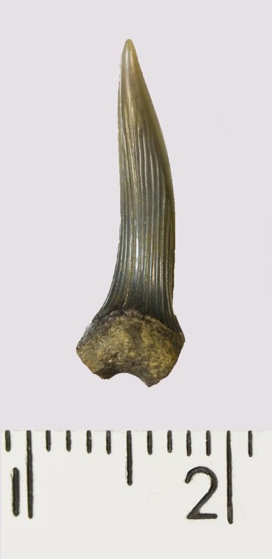 Зуб (фрагмент). Акула. Scapanorhynchus rhaphiodon Agassiz, 1843. Классификация: Хордовые Chordata, Позвоночные Vertebrata, Хрящевые рыбы Chondrichthyes, Пластиножаберные Elasmobranchii