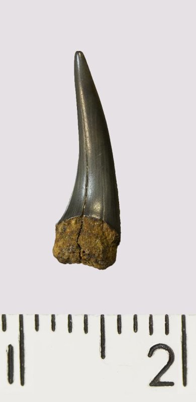 Зуб (фрагмент). Акула. Scapanorhynchus rhaphiodon Agassiz, 1843. Классификация: Хордовые Chordata, Позвоночные Vertebrata, Хрящевые рыбы Chondrichthyes, Пластиножаберные Elasmobranchii