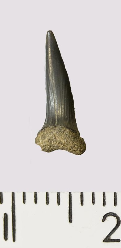 Зуб. Акула. Scapanorhynchus rhaphiodon Agassiz, 1843. Классификация: Хордовые Chordata, Позвоночные Vertebrata, Хрящевые рыбы Chondrichthyes, Пластиножаберные Elasmobranchii