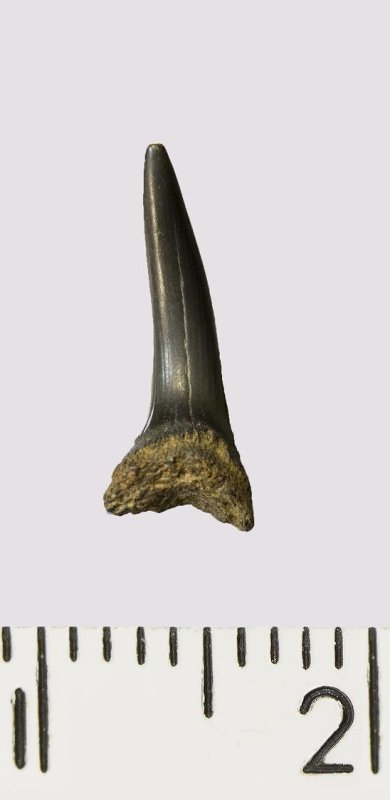 Зуб. Акула. Scapanorhynchus rhaphiodon Agassiz, 1843. Классификация: Хордовые Chordata, Позвоночные Vertebrata, Хрящевые рыбы Chondrichthyes, Пластиножаберные Elasmobranchii