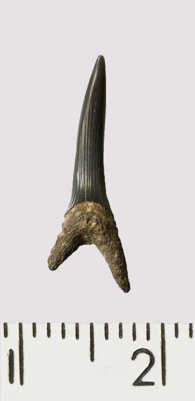 Зуб. Акула. Scapanorhynchus rhaphiodon Agassiz, 1843. Классификация: Хордовые Chordata, Позвоночные Vertebrata, Хрящевые рыбы Chondrichthyes, Пластиножаберные Elasmobranchii