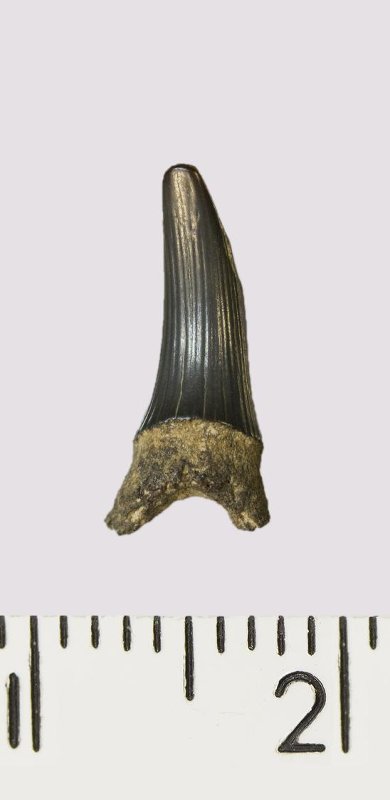 Зуб. Акула. Scapanorhynchus rhaphiodon Agassiz, 1843. Классификация: Хордовые Chordata, Позвоночные Vertebrata, Хрящевые рыбы Chondrichthyes, Пластиножаберные Elasmobranchii