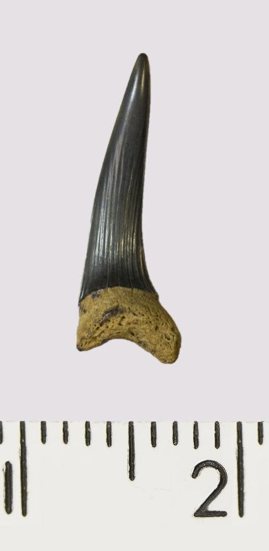 Зуб. Акула. Scapanorhynchus rhaphiodon Agassiz, 1843. Классификация: Хордовые Chordata, Позвоночные Vertebrata, Хрящевые рыбы Chondrichthyes, Пластиножаберные Elasmobranchii
