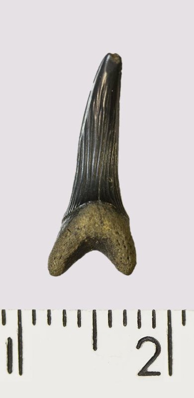 Зуб. Акула. Scapanorhynchus rhaphiodon Agassiz, 1843. Классификация: Хордовые Chordata, Позвоночные Vertebrata, Хрящевые рыбы Chondrichthyes, Пластиножаберные Elasmobranchii