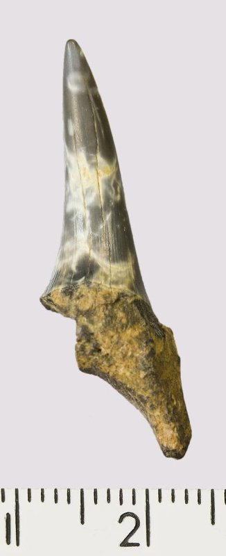 Зуб. Акула. Rhaphiodus sp. Классификация: Хордовые Chordata, Позвоночные Vertebrata, Хрящевые рыбы Chondrichthyes, Пластиножаберные Elasmobranchii
