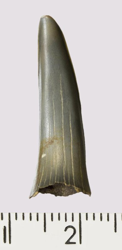 Зуб (фрагмент). Акула. Scapanorhynchus gigas Woodward, 1889. Классификация: Хордовые Chordata, Позвоночные Vertebrata, Хрящевые рыбы Chondrichthyes, Пластиножаберные Elasmobranchii