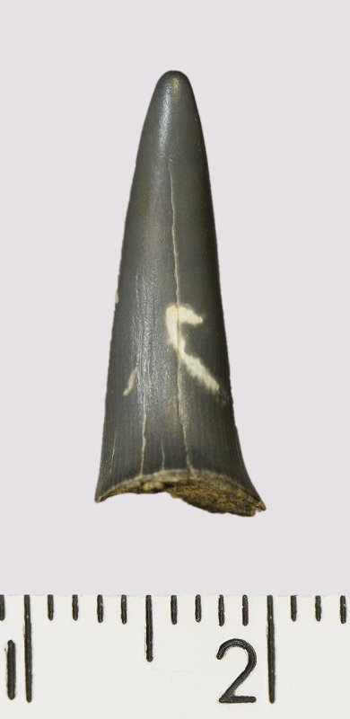 Зуб (фрагмент). Акула. Scapanorhynchus gigas Woodward, 1889. Классификация: Хордовые Chordata, Позвоночные Vertebrata, Хрящевые рыбы Chondrichthyes, Пластиножаберные Elasmobranchii