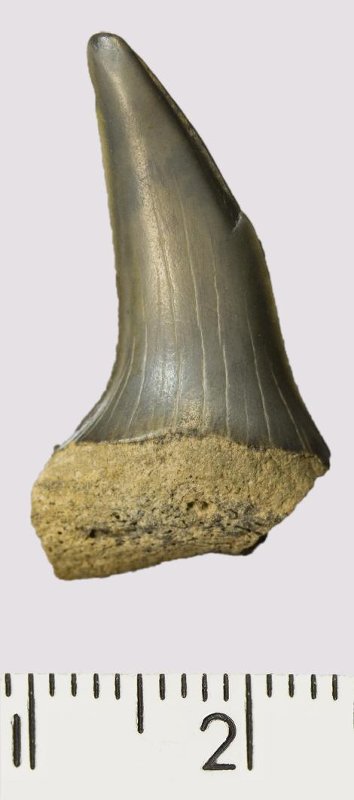 Зуб (фрагмент). Акула. Scapanorhynchus gigas Woodward, 1889. Классификация: Хордовые Chordata, Позвоночные Vertebrata, Хрящевые рыбы Chondrichthyes, Пластиножаберные Elasmobranchii
