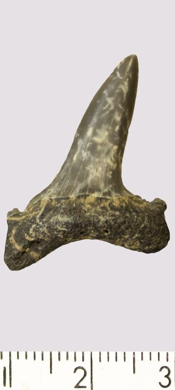 Зуб. Акула. Scapanorhynchus gigas Woodward, 1889. Классификация: Хордовые Chordata, Позвоночные Vertebrata, Хрящевые рыбы Chondrichthyes, Пластиножаберные Elasmobranchii