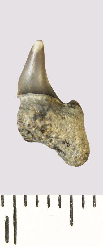 Зуб. Акула. Odontaspis macrorhiza (Cope) Leriche, 1902. Классификация: Хордовые Chordata, Позвоночные Vertebrata, Хрящевые рыбы Chondrichthyes, Пластиножаберные Elasmobranchii