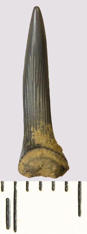 Зуб. Акула. Scapanorhynchus rhaphiodon Agassiz, 1843. Классификация: Хордовые Chordata, Позвоночные Vertebrata, Хрящевые рыбы Chondrichthyes, Пластиножаберные Elasmobranchii