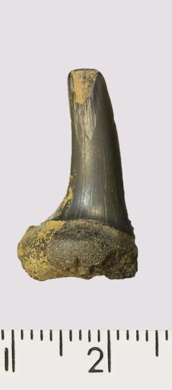 Зуб (фрагмент). Акула. Scapanorhynchus gigas Woodward, 1889. Классификация: Хордовые Chordata, Позвоночные Vertebrata, Хрящевые рыбы Chondrichthyes, Пластиножаберные Elasmobranchii