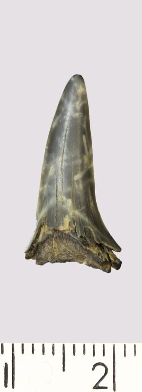 Зуб (фрагмент). Акула. Scapanorhynchus gigas Woodward, 1889. Классификация: Хордовые Chordata, Позвоночные Vertebrata, Хрящевые рыбы Chondrichthyes, Пластиножаберные Elasmobranchii