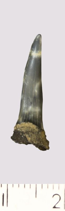 Зуб (фрагмент). Акула. Scapanorhynchus gigas Woodward, 1889. Классификация: Хордовые Chordata, Позвоночные Vertebrata, Хрящевые рыбы Chondrichthyes, Пластиножаберные Elasmobranchii