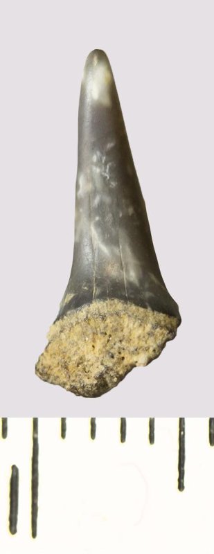 Зуб (фрагмент). Акула. Lamniformes gen. et sp. indet. Классификация: Хордовые Chordata, Позвоночные Vertebrata, Хрящевые рыбы Chondrichthyes, Пластиножаберные Elasmobranchii