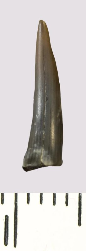 Зуб (фрагмент). Акула. Scapanorhynchus rhaphiodon Agassiz, 1843. Классификация: Хордовые Chordata, Позвоночные Vertebrata, Хрящевые рыбы Chondrichthyes, Пластиножаберные Elasmobranchii