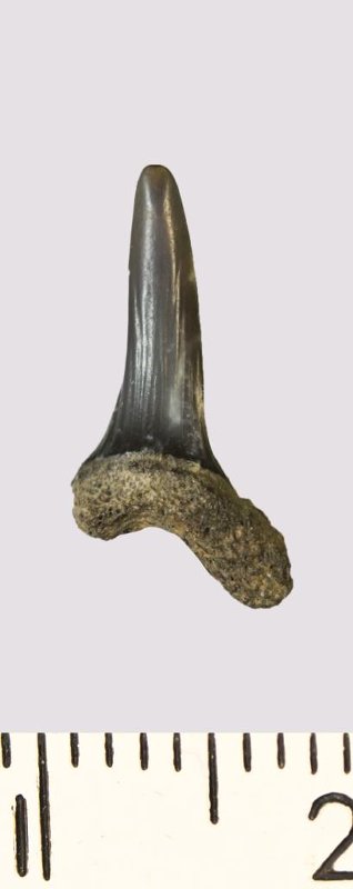Зуб. Акула. Scapanorhynchus rhaphiodon Agassiz, 1843. Классификация: Хордовые Chordata, Позвоночные Vertebrata, Хрящевые рыбы Chondrichthyes, Пластиножаберные Elasmobranchii