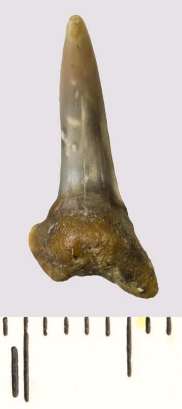 Зуб. Акула. Scapanorhynchus rhaphiodon Agassiz, 1843. Классификация: Хордовые Chordata, Позвоночные Vertebrata, Хрящевые рыбы Chondrichthyes, Пластиножаберные Elasmobranchii