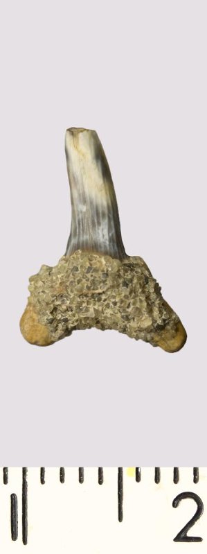 Зуб. Акула. Scapanorhynchus rhaphiodon Agassiz, 1843. Классификация: Хордовые Chordata, Позвоночные Vertebrata, Хрящевые рыбы Chondrichthyes, Пластиножаберные Elasmobranchii