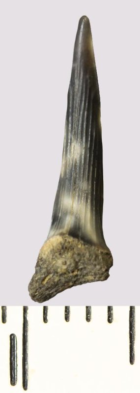 Зуб. Акула. Scapanorhynchus rhaphiodon Agassiz, 1843. Классификация: Хордовые Chordata, Позвоночные Vertebrata, Хрящевые рыбы Chondrichthyes, Пластиножаберные Elasmobranchii