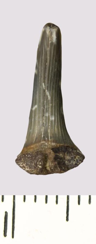 Зуб. Акула. Scapanorhynchus rhaphiodon Agassiz, 1843. Классификация: Хордовые Chordata, Позвоночные Vertebrata, Хрящевые рыбы Chondrichthyes, Пластиножаберные Elasmobranchii