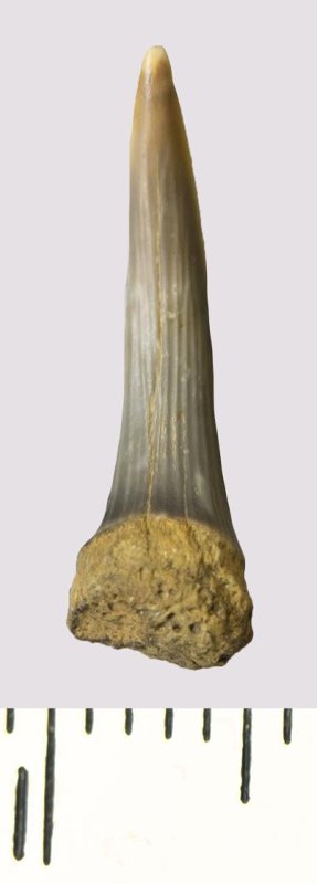 Зуб. Акула. Scapanorhynchus rhaphiodon Agassiz, 1843. Классификация: Хордовые Chordata, Позвоночные Vertebrata, Хрящевые рыбы Chondrichthyes, Пластиножаберные Elasmobranchii