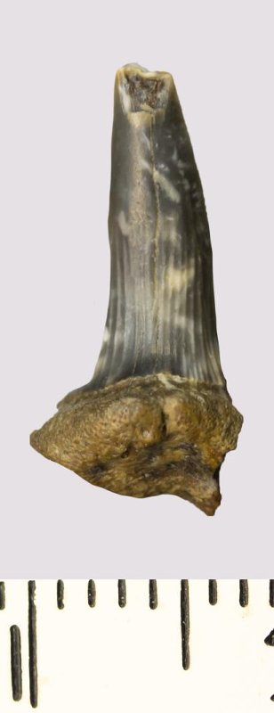 Зуб. Акула. Scapanorhynchus rhaphiodon Agassiz, 1843. Классификация: Хордовые Chordata, Позвоночные Vertebrata, Хрящевые рыбы Chondrichthyes, Пластиножаберные Elasmobranchii