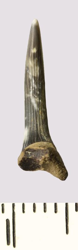 Зуб. Акула. Scapanorhynchus rhaphiodon Agassiz, 1843. Классификация: Хордовые Chordata, Позвоночные Vertebrata, Хрящевые рыбы Chondrichthyes, Пластиножаберные Elasmobranchii