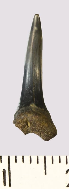 Зуб. Акула. Scapanorhynchus rhaphiodon Agassiz, 1843. Классификация: Хордовые Chordata, Позвоночные Vertebrata, Хрящевые рыбы Chondrichthyes, Пластиножаберные Elasmobranchii