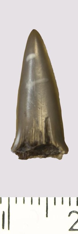 Зуб (фрагмент). Акула. Scapanorhynchus gigas Woodward, 1889. Классификация: Хордовые Chordata, Позвоночные Vertebrata, Хрящевые рыбы Chondrichthyes, Пластиножаберные Elasmobranchii