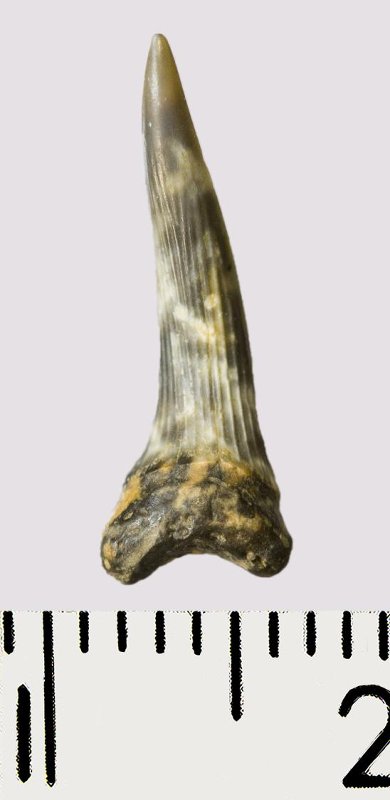 Зуб. Акула. Scapanorhynchus rhaphiodon Agassiz, 1843. Классификация: Хордовые Chordata, Позвоночные Vertebrata, Хрящевые рыбы Chondrichthyes, Пластиножаберные Elasmobranchii