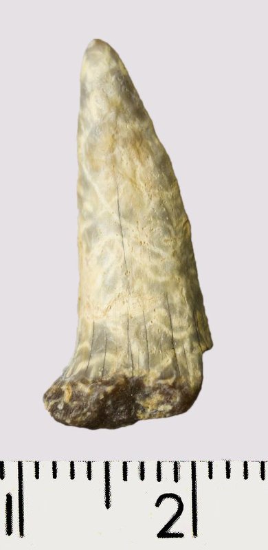 Зуб (фрагмент). Акула. Scapanorhynchus gigas Woodward, 1889. Классификация: Хордовые Chordata, Позвоночные Vertebrata, Хрящевые рыбы Chondrichthyes, Пластиножаберные Elasmobranchii