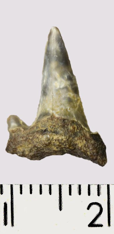 Зуб. Акула. Odontaspis macrorhiza (Cope) Leriche, 1902. Классификация: Хордовые Chordata, Позвоночные Vertebrata, Хрящевые рыбы Chondrichthyes, Пластиножаберные Elasmobranchii