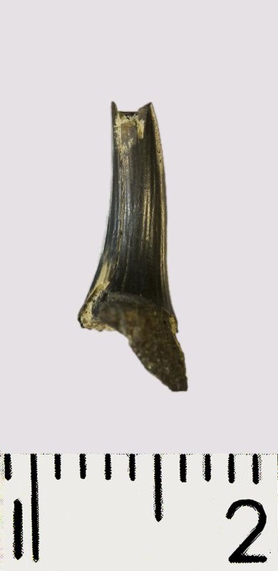 Зуб (фрагмент). Акула. Scapanorhynchus rhaphiodon Agassiz, 1843. Классификация: Хордовые Chordata, Позвоночные Vertebrata, Хрящевые рыбы Chondrichthyes, Пластиножаберные Elasmobranchii